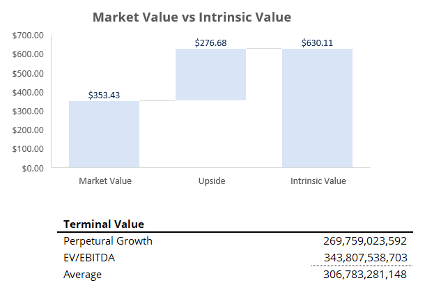 This leads to the below valuation where we find large upside at a $630 target. From current market prices of $353 that suggests an upside of 78% which is incredibly high.