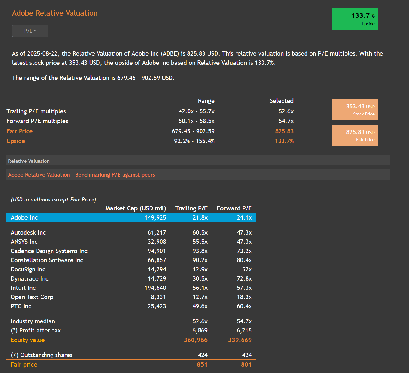 On multiples-based valuation, Adobe stands at a forward P/E of 24.1x, which seems fairly valued to me. Despite the below image, I find that extremely high P/E ratios are not clearly justified among this basket of peers.
